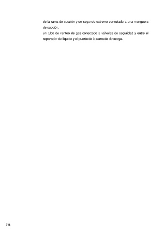 de la rama de succión y un segundo extremo conectado a una manguera de succión, un tubo de venteo de gas conectado a válvulas de seguridad y entre el separador de líquido y el puerto de la rama de descarga. 748